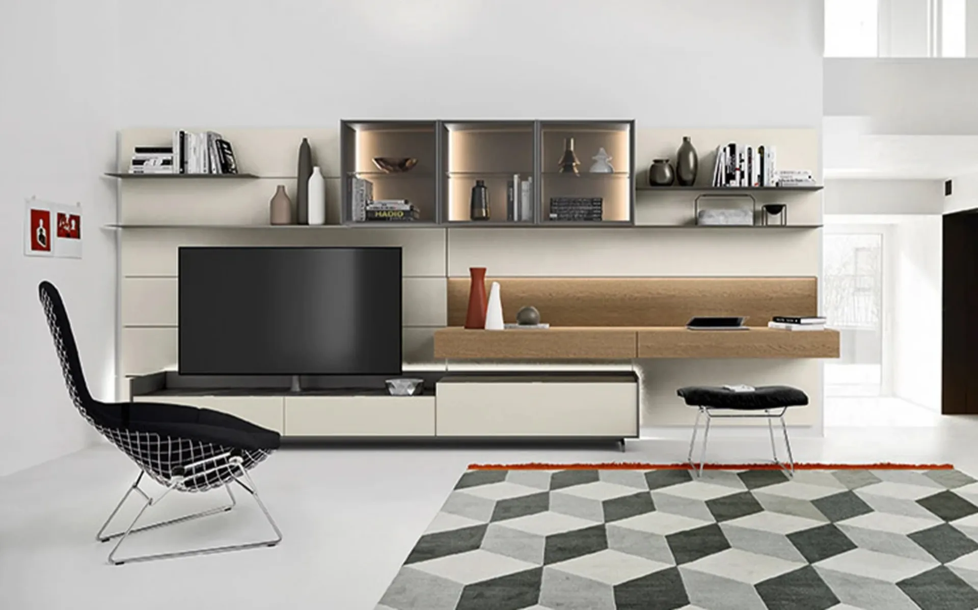 Le Pareti Attrezzate hanno assunto un posto importante nella zona giorno delle nostre case: sono mobili multifunzionali e salvaspazio sempre realizzabili su misura. Attraverso un gioco dinamico di accostamenti fra elementi a giorno o vani chiusi, le Pareti Attrezzate moderne arredano il living usufruendo al meglio di ogni spazio. Questa parete attrezzata è una delle soluzioni dell'azienda e ti permetterà di progettare il living secondo le più particolari esigenze abitative.