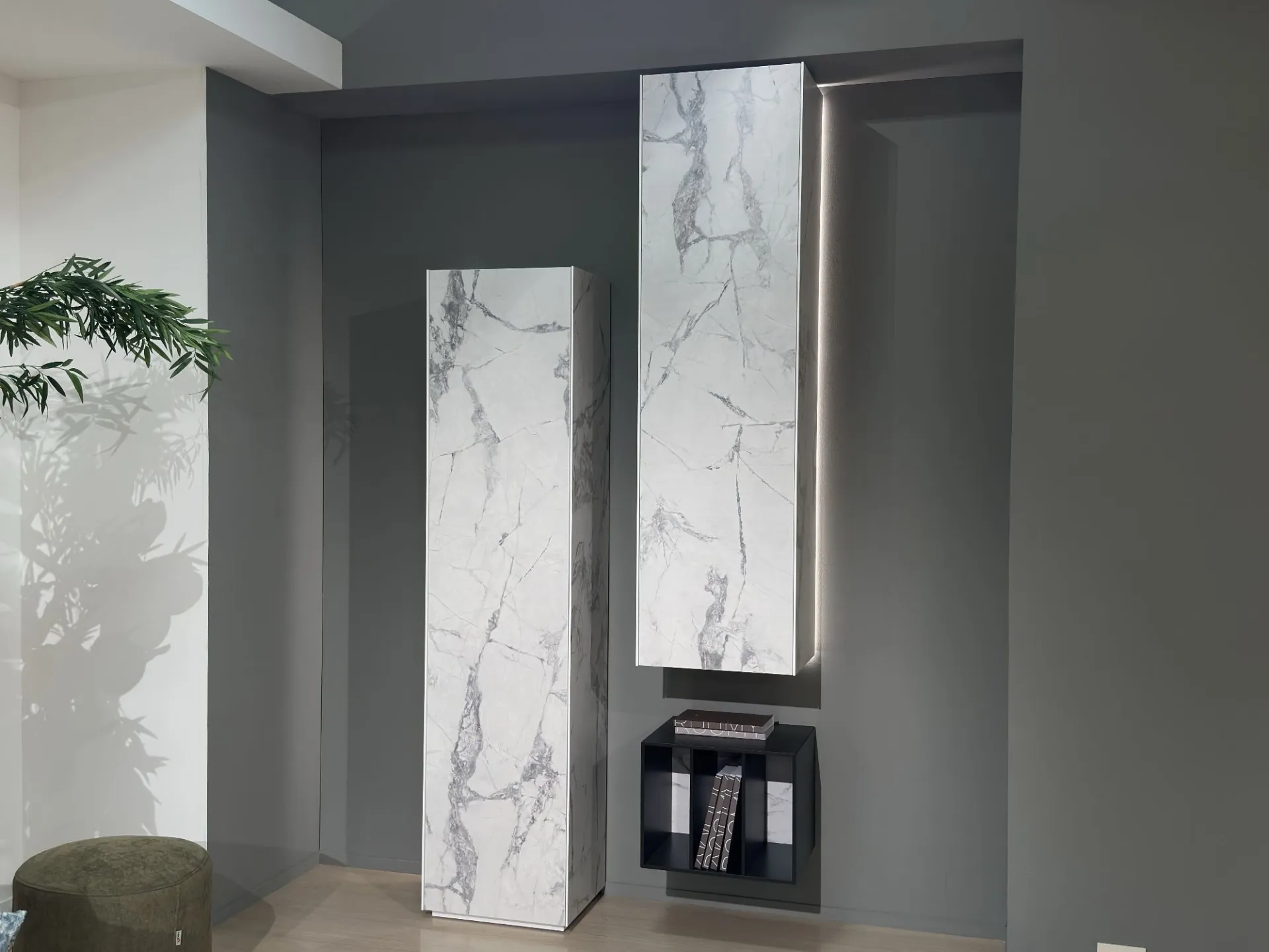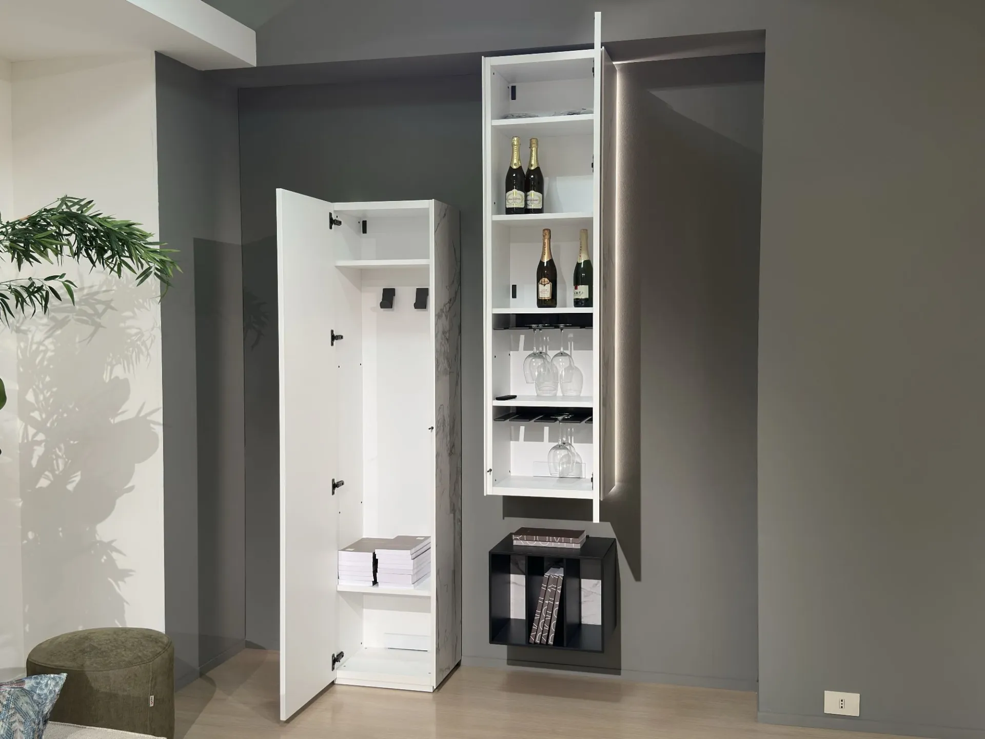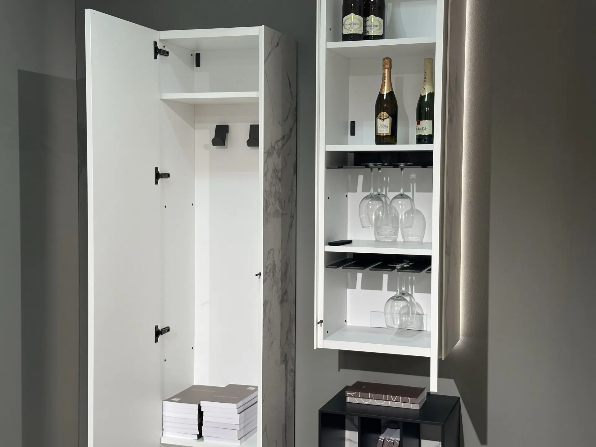 I pilastri, di due differenti altezze, conferiscono carattere e verticalità: il primo (H cm 192, L cm 45, P cm 35,5) è appggiato a terra ed è attrezzato con due ripiani e due appendiabiti; il secondo (H cm 160, L cm 45, P cm 35,5) è sospeso e oltre ad avere più ripiani è anche attrezzato con due porta calici. Sono anche retroilluminati nei perimetri laterali esterni.